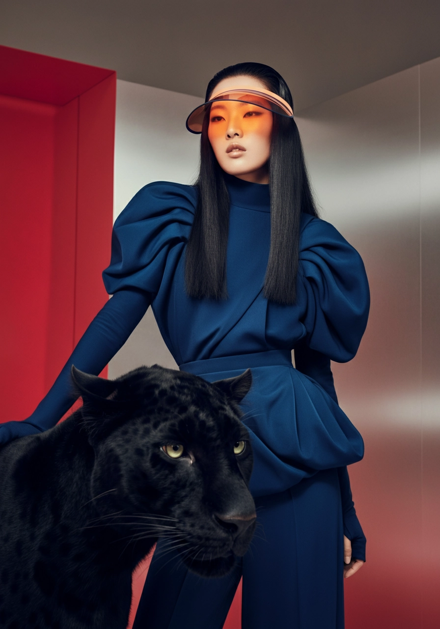 A 4K photo of a female model in a deep sapphire blue high-fashion outfit with sculptural and fluid details, creating an elegant yet futuristic aesthetic. The model has long, jet-black hair styled into a sleek, asymmetrical cut. She is wearing a transparent visor covering her eyes, which refracts soft light into subtle, golden hues. The model is posing beside a sleek, black panther. The background is a minimalist space with muted crimson and silver tones. The lighting is natural, casting soft shadows that add depth and dimension to the scene.