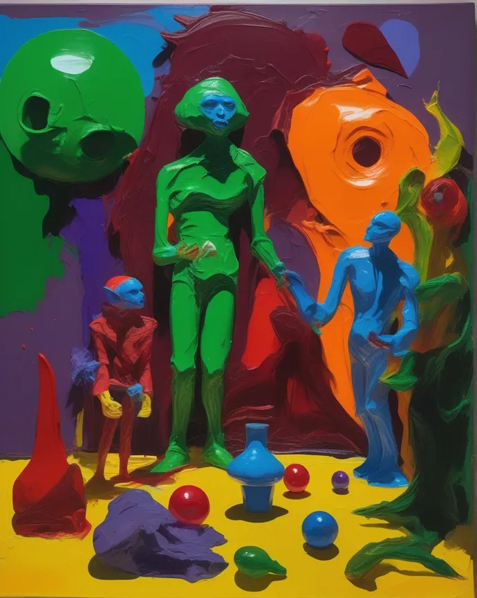 Alien landscape with blown glass and toys and plastic plants. Models wearing weird fashion. Yellow, blue and green and red and ruby. Surreal painting. Style of de Kooning and 60s art.
