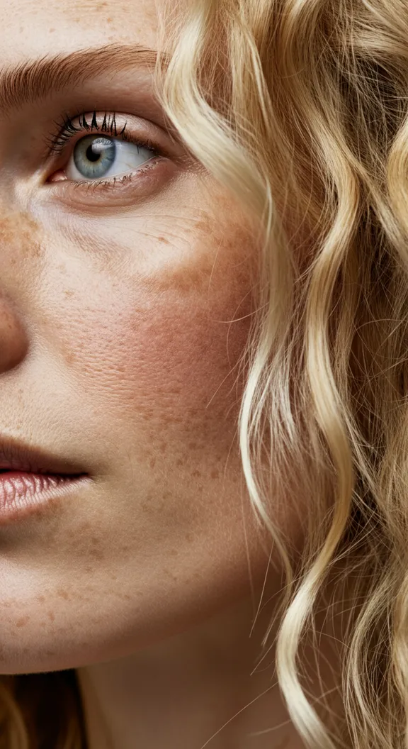 Macro cosmetic lips shot, super realistic, clean lips on whole screen, freckles, pores, super natural, raw photo, close shot, no edited photo, looking away, shine skin, low contrast, big octabox lighting, raw studio photo, no makeup, beautiful textured skin, white background, sarah brown style, natural blond wavy hair, a lot of texture, everything is in focus, very detailed, nikon z7, f22, 70 mm, full frame