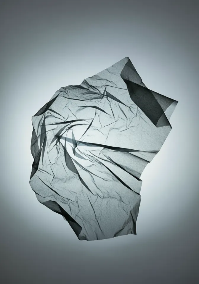A crumpled piece of translucent paper floats against a soft grey background. The paper is illuminated in vibrant shades of gray and blue, creating a striking contrast with the muted backdrop. The lighting emphasizes the texture and folds of the paper, giving it a dynamic and abstract appearance. The composition is centered, with a minimalist and modern aesthetic, evoking a sense of calm and curiosity.