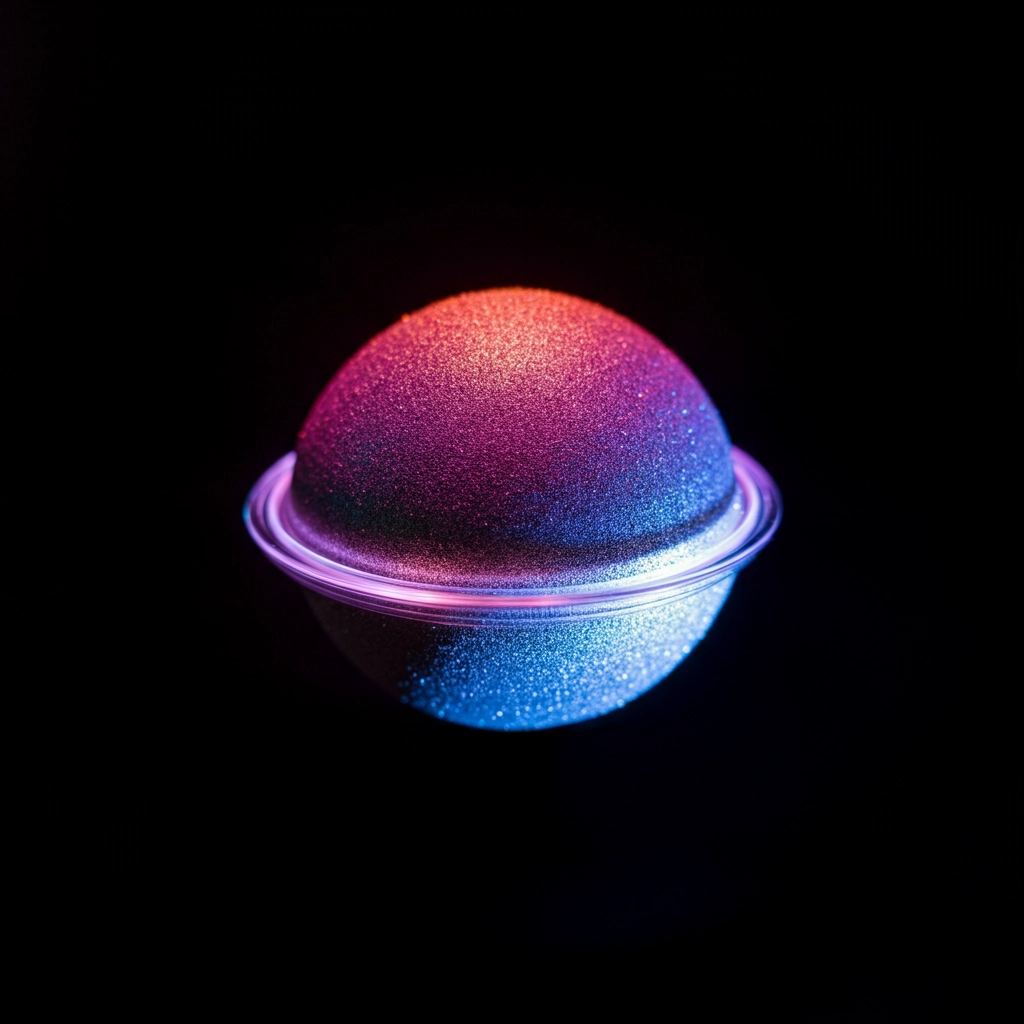 Light glowing round shape that looks planet with purple/pink/blue accent on edge on a pure black background