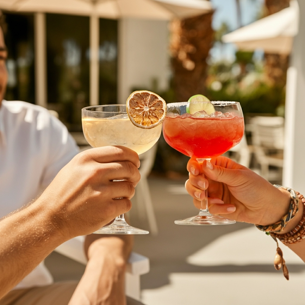 Two people clinking glasses, one with a slice of sun dried citrus garnish in the cocktail. The other cocktail is red with a lime wedge on the rim. The setting suggests an outdoor Palm springs, California patio. The camera angle captures the hands in a close-up, focusing on the refreshing beverages and casual, summery attire. The scene conveys a relaxed, sociable atmosphere ideal for a leisurely afternoon. show mostly