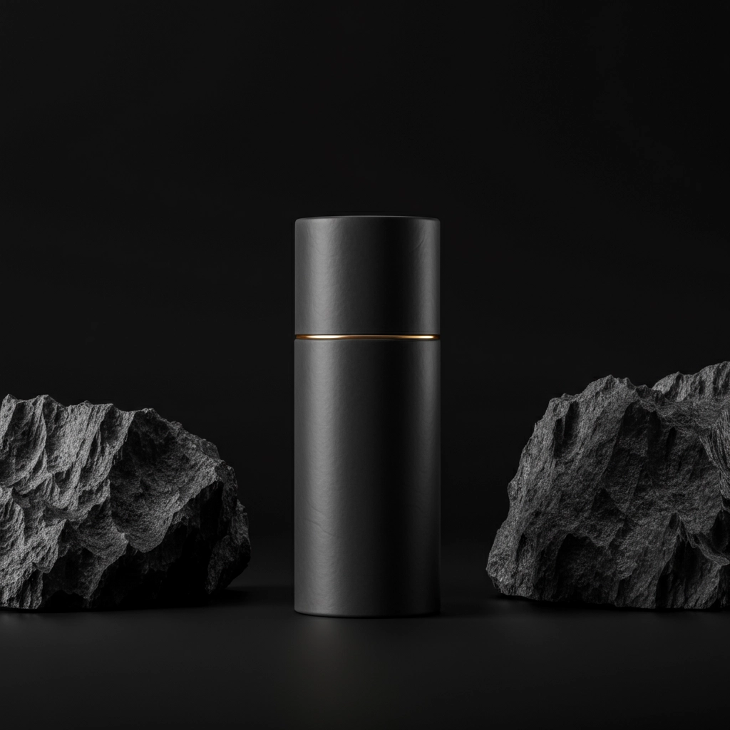 Epic shot of a short, matt black cylindrical paper tube small size positioned between two jagged black rocks, positioned upright, facing the viewer, with harsh lighting coming directly from above. The transparent bottle showcases clear liquid inside, lighting is edgy and direct, creating a clean and minimalistic ambiance. The perspective is angled, clean and minimalist aesthetics.