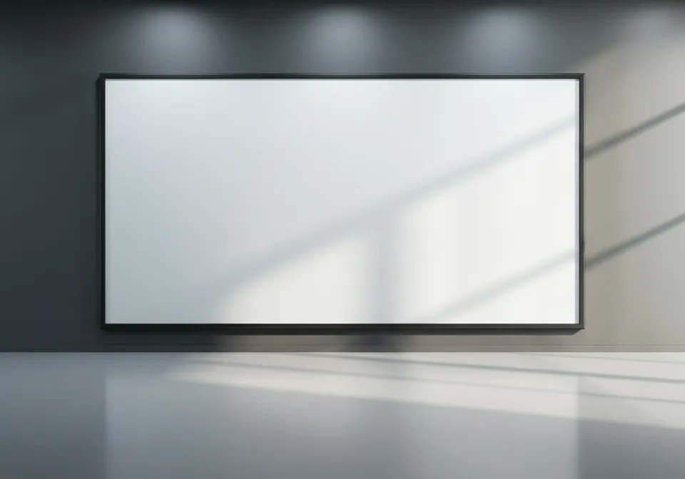 A realistic mockup of a blank horizontal billboard mounted on a wall. The billboard is large, with a sleek black frame surrounding a completely white, clean surface. The environment is minimalistic, with soft lighting creating subtle shadows. The perspective is frontal and capturing the entire billboard in a professional and modern setting."