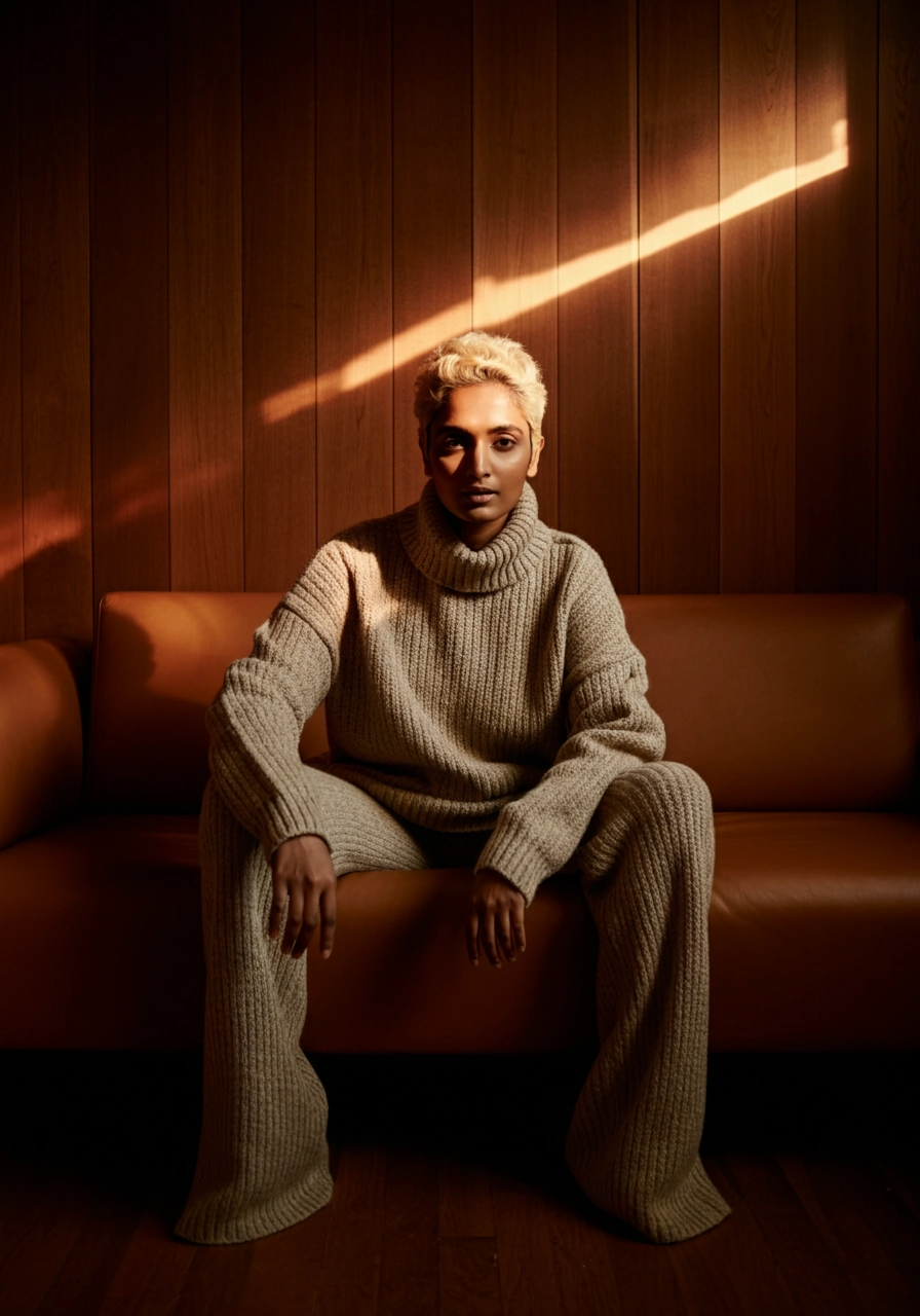 A wide-angle, hyper-realistic portrait of a stunning young Indian female model with short, blonde, naturally textured hair, exuding confidence and elegance. She wears a contemporary winter outfit entirely made of knit, featuring a stylish oversized sweater and tailored knit pants in soft, neutral tones. The knit fabric drapes naturally, emphasizing warmth and texture. She sits with a relaxed yet poised posture on a modern caramel-colored couch, set against a wooden panel backdrop adorned with an adhesive image of a serene sunset. The backdrop displays a gradient of red, orange, and yellow hues, mimicking the warmth and tranquility of a fading sun. The scene is shot with Kodak 400TX film, embracing the aesthetic imperfections of analog photography. The image incorporates manual camera handling effects, such as subtle grain, organic lens flare, soft focus variations, and slight motion blur. The French contemporary aesthetic is enhanced with flash photography, creating bold highlights, deep shadows, and a rich interplay of textures. The wooden floor and paneling add a sense of depth and natural texture, complementing the cozy yet sophisticated atmosphere. Inspired by editorial shoots from Mert & Marcus and Nick Knight, this photograph captures an effortlessly chic, modern, and artistic vision of winter fashion. Shot on professional DSLR film in ultra-high-definition (32K), the image maintains an impeccable balance of realism, avant-garde fashion, and photographic nostalgia.