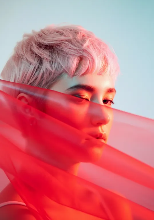 A dreamy and ethereal photograph of a person with short pastel pink hair, partially obscured by a translucent red fabric or material. The lighting is soft and diffused, creating a hazy and artistic effect. The subject’s face is partially hidden, adding mystery and abstraction. The colour palette emphasises warm tones of red and pink, blending seamlessly with light blue in the background. Key words: soft focus, contemporary fashion photography, ethereal aesthetic, pastel colours, cinematic lighting. artistic inspiration: experimental editorial style, hazy photography