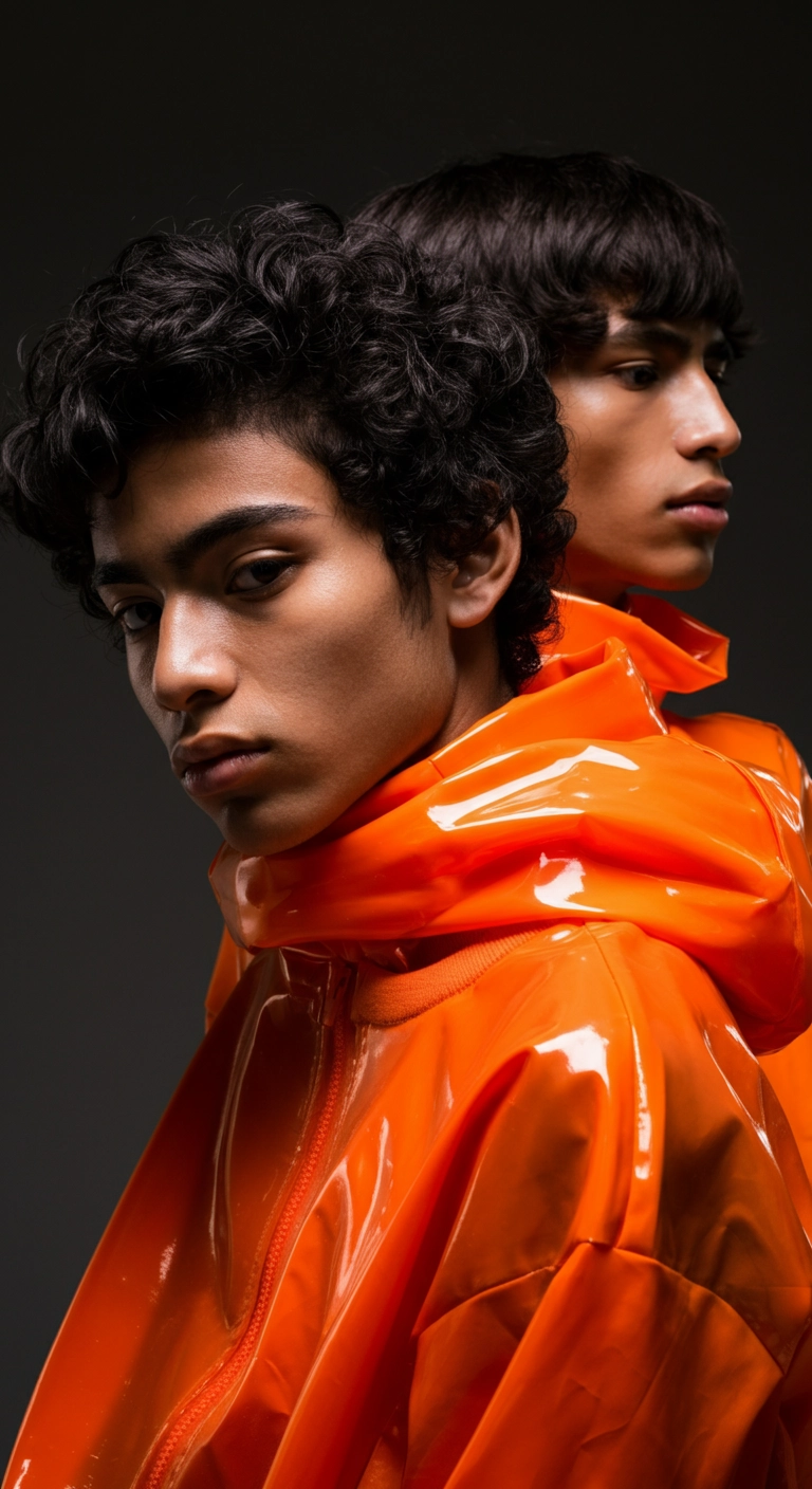 Ein hyperrealistisches detailreiches Portrait Foto Zwei androgynen dünnen 22jährigen Latino Model Boy, lockige Haare mit avantgardistischen orangen Outfits aus Kunststoff, futuristische Kopfbedeckung, ganzer Körper, high fashion Editorial