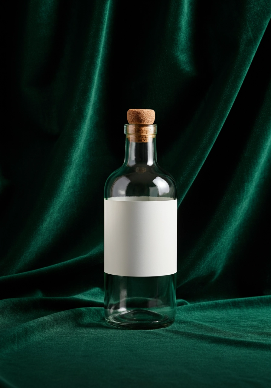 A clear glass bottle with a blank white label and a cork stopper is centered against a rich green velvet backdrop. The fabric's luxurious texture creates soft folds and shadows, enhancing the bottle’s transparency and simplicity. The lighting is soft and diffused, highlighting the bottle's contours and the smooth surface of the velvet. The composition focuses on minimalism and elegance, with a straight-on frontal perspective. The mood is calm and sophisticated, evoking a sense of understated luxury.