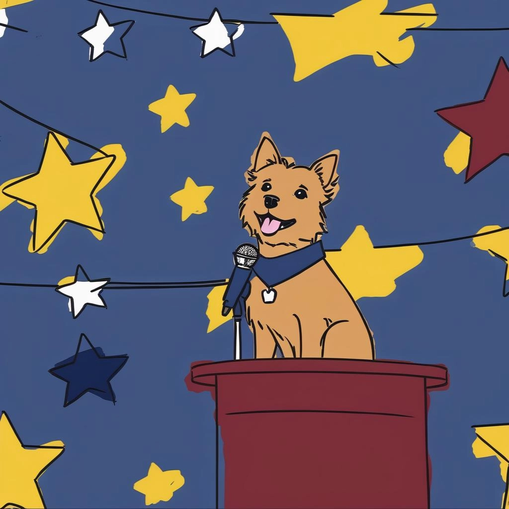 a norwich terrier sits on a podium behind a microphone with star covered flag banners