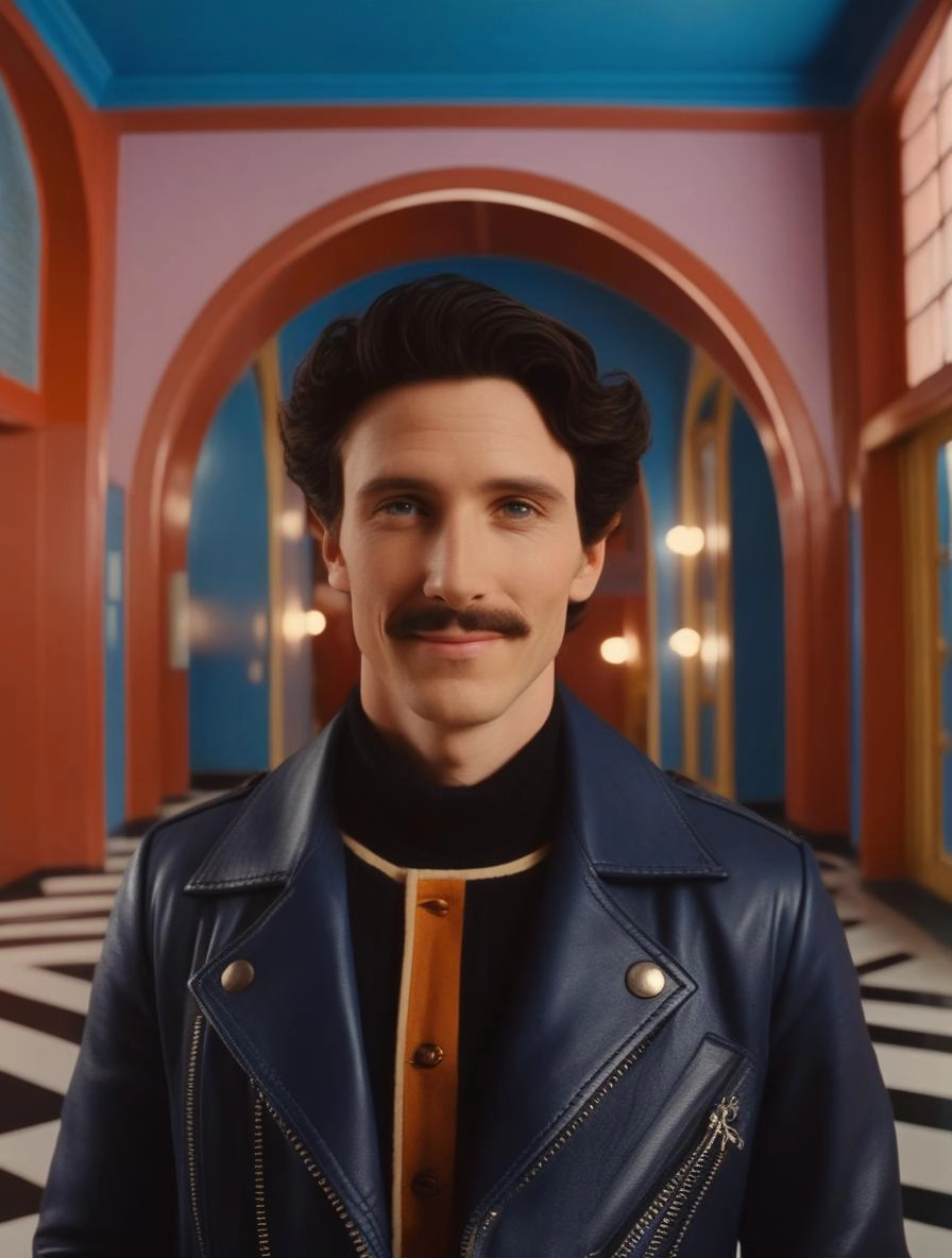 man with dark hair, black leather jacket, smiling, blue background, album cover aesthetic