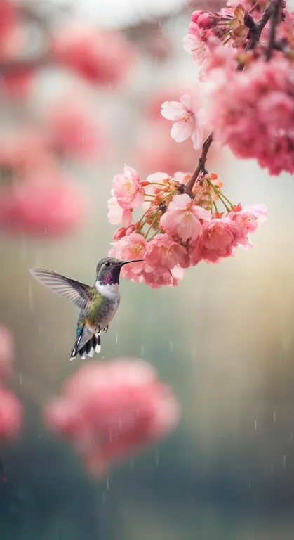 love warmth blossoming in spring rain on vibrant cherry blossoms with hummingbird whizzing by