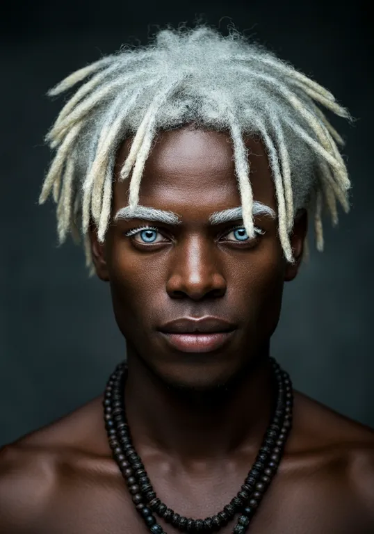 Portrait photography of an african man with white hair and blue eyes, dreadlocks hairstyle, facing the camera, front facing posture, posed for a photo in studio lighting against dark background, in the style of Guy Aroch