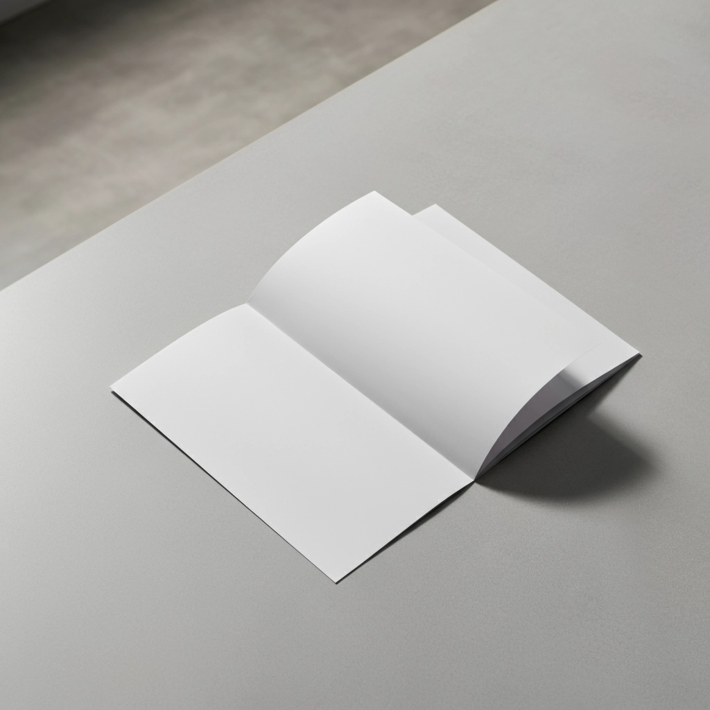 mockup of a DIN A4 brochure with white blank pages in portrait format lying on a concrete modern table in a minimalistic office setting, two brochures are lying on the table, one is open and the other closed, minimalistic style, white light grey color setting