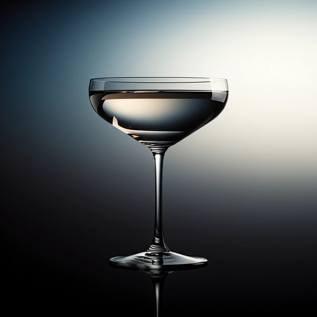 Create a hyper-realistic image of a coupe glass with a thin stem and a broad, shallow bowl. The glass should be placed against a gradient background transitioning from dark black at the bottom to a soft, muted blue and white towards the top. Ensure the glass catches light, creating a bright sparkle at its rim for added elegance. Emphasize the transparency, reflections, and refractive qualities of the glass, with a sleek and minimalistic design. The focus should be on the glass with a polished and luxurious aesthetic
