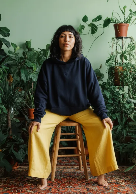 1970s marketing photo of a summer-themed scene featuring an hispanic female in her mid 30s with mid back length hair and minimal; small tattoos sitting on old wooden stool, wearing an oversized black boxy fit streetwear hoodie with no strings and yellow linen wide leg pants, she is barefoot. Her back is towards the camera showing her full back, sh. The background is a pale green, She is surrounded by a ridiculous amount of plants, so many plants filling the room that they cover the space entirely, including robust and fuller Monstera plants and ficus trees growing tall, the floor features an ornate, multicolored Persian rug. enhancing the focus on the subjects. The lighting is soft and even, accentuating the vibrant and playful atmosphere. The composition is awkwardly balanced with a full-body perspective, emphasizing a casual yet trendy vibe. it feels retro and awkward