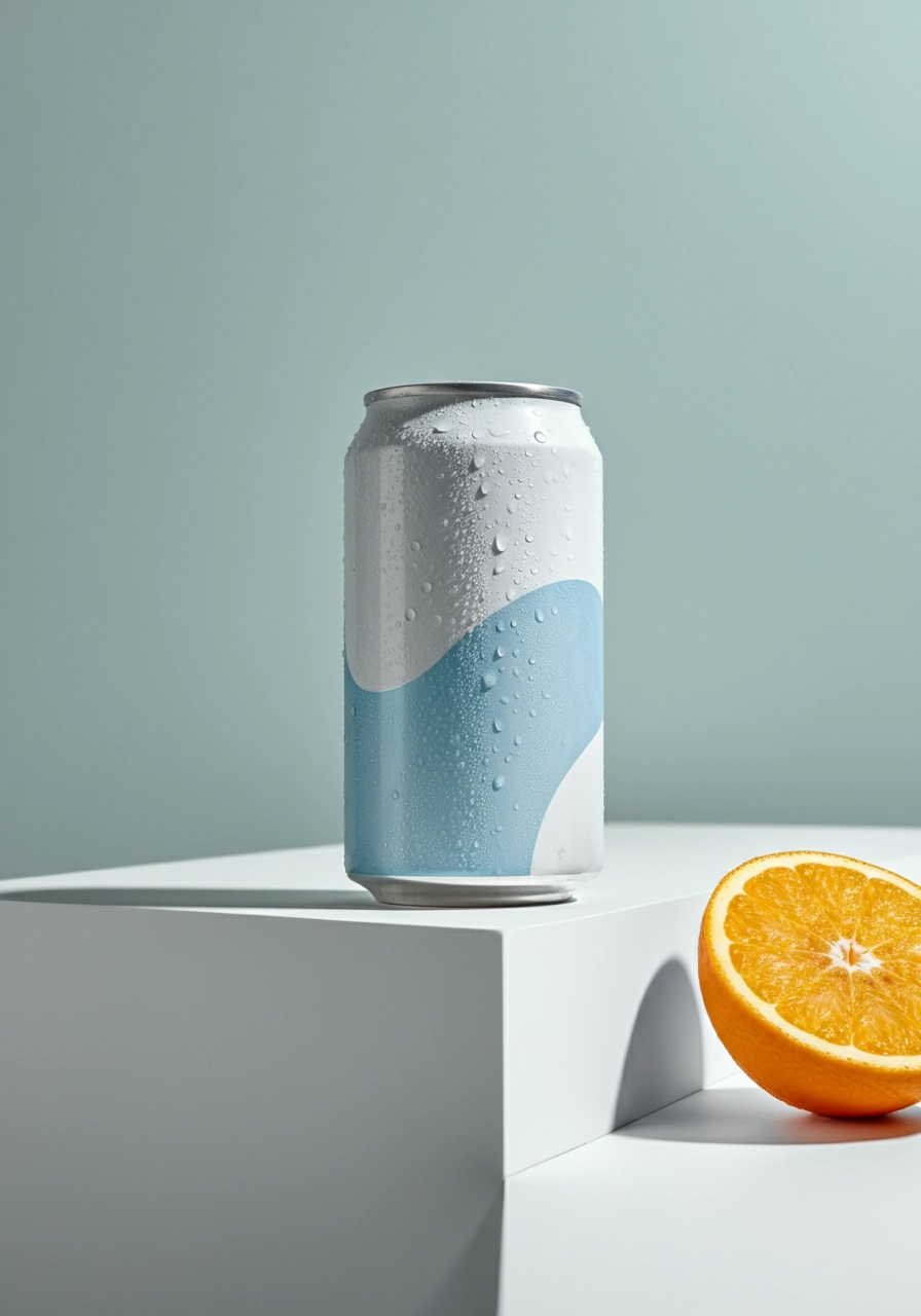 a white soda can with light blue colors and rounded elements stands on the corner of a large white platform. Drops of condensation are visible on the can. A cut orange lies beside the can. Frontal view. A close-up of the can. Camera from bottom to top
