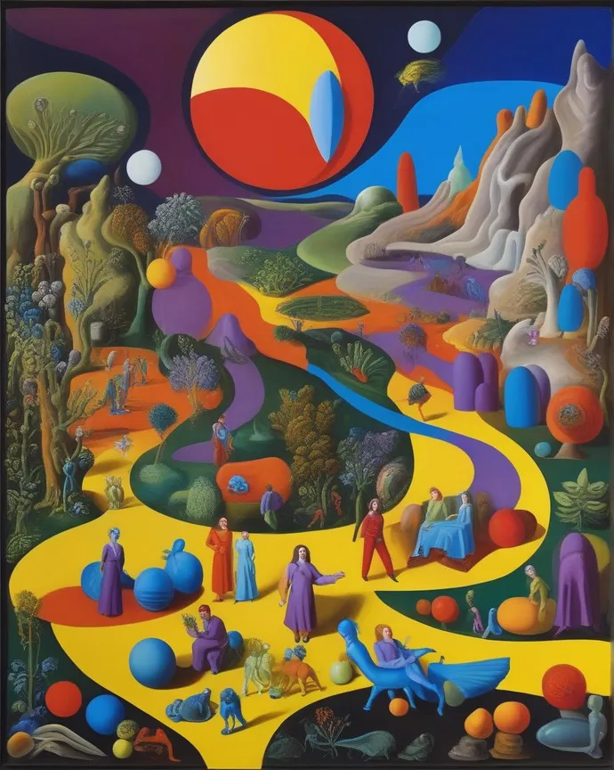 Alien landscape with blown glass and toys and plastic plants. Models wearing weird fashion. Yellow, blue and green and red and ruby. Surreal painting. Style of de Kooning and 60s art.