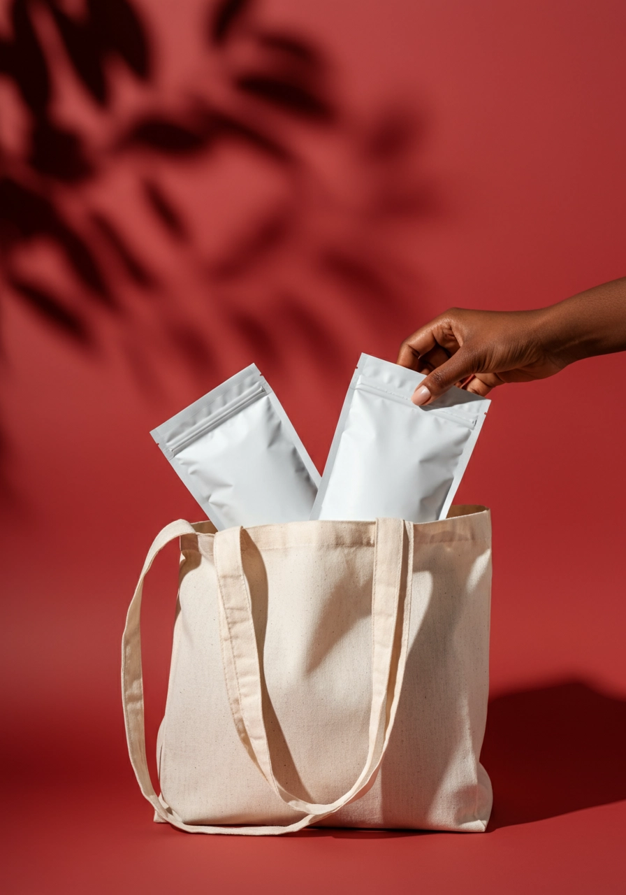 2 white plain standup snack pouch popping out from a white red tote bag in a red photography studio background with leaves shadows. a black woman hand picking up