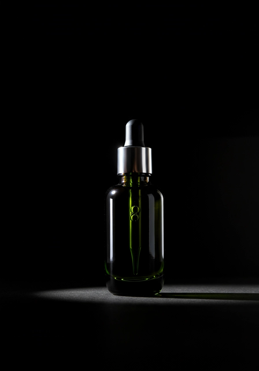 Minimalistic and professional studio photograph of a sleek laboratory-grade cosmetic bottle, such as a serum or cream container, designed for a scientific aesthetic. Captured with a side angle, the bottle is placed against a completely black seamless background, using a DSLR camera with an 85mm prime lens. Low-key lighting emphasizes the contours and glossy details of the container, creating dramatic shadows and soft glowing highlights on the glass or metallic features. The atmosphere conveys sophistication and precision, perfect for a luxury cosmetic product.