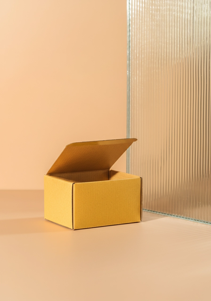 a realistic small 3x4x2" brown mailer box slightly opened on a light peach room background with corrugated glass in half of the background