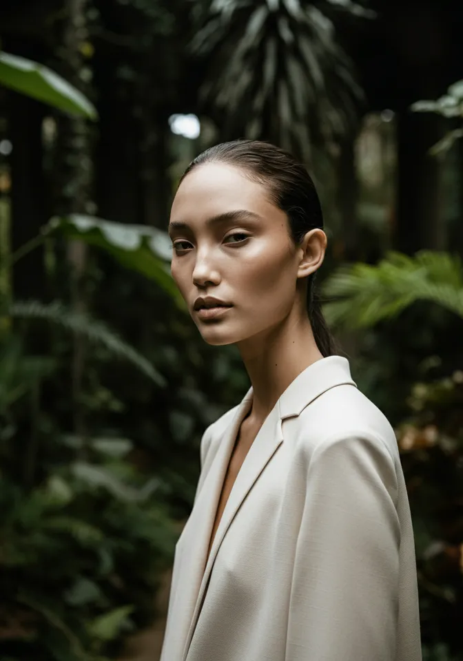 Minimalist fashion photography with a timeless, chic aesthetic. A half-body portrait in the foreground of a Brazilian model with delicate Oriental features, a slender physique, and naturally radiant skin. She has a soft, relaxed expression with a very subtle, graceful smile. Her makeup is minimal and fresh, enhancing her natural beauty without overpowering her features. She is wearing an elegant, minimalist outfit in soft off-white tones, with a sophisticated and understated design that feels both modern and timeless. The setting is a vast, open tropical garden, filled with lush greenery and depth, without visible walls or enclosures, creating a serene and natural atmosphere. The photograph is taken from a slightly lower angle for a refined perspective. The lighting is soft and diffused, gently illuminating her skin while creating delicate, flattering shadows. Captured using a Hasselblad H6D-100c camera with an HC 120/4 lens, ensuring exceptional sharpness and detail. The overall look is clean, harmonious, and effortlessly sophisticated, with natural tones and textures blending seamlessly into the environment. RAW format, high resolution, crisp details, realistic rendering, and natural color grading.