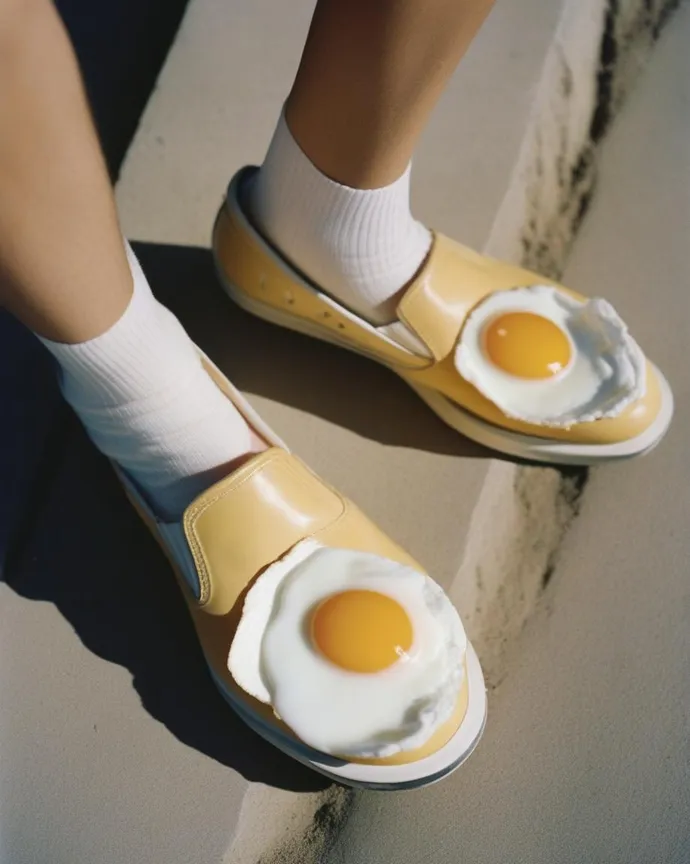 Sunny side up fried eggs as shoes