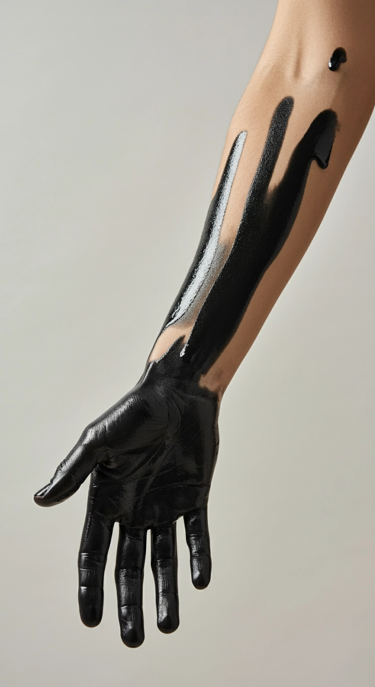 A close-up of a human arm and hand, covered in glossy black paint or a similar liquid, creating a stark contrast against the skin. The background is a plain off-white, emphasizing the subject. The light source is subtle, allowing the black substance to reflect hints of light, adding a shiny, almost metallic texture. The arm is positioned downward in a relaxed manner, with the focus on the hand's fluid shape and the irregular paint drips. The composition has a minimalist and abstract feel, with a focus on texture and contrast.