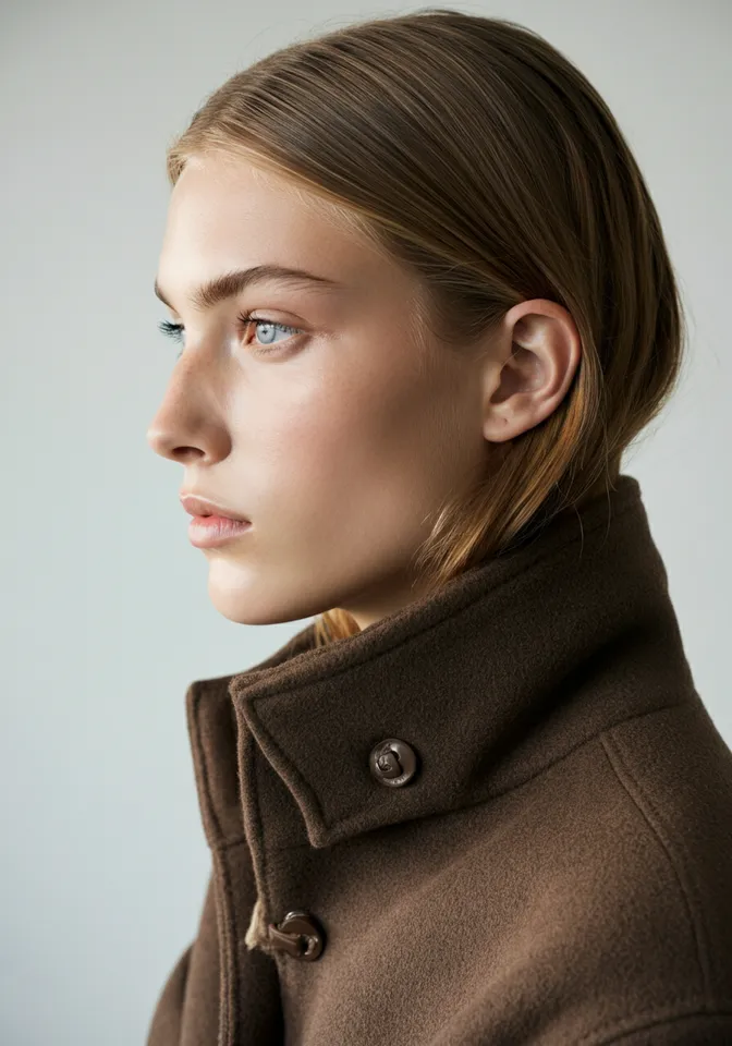 A high-end fashion portrait featuring a young woman model with blue eyes in a studio. The model is sharply captured in profile with a defined jawline and a thoughtful expression. He Wearing a luxury swetear brown. The photography is shot using an 8K Canon EOS R5 with a 105mm macro lens, utilizing studio lighting for soft shadow detail and cinematic contrast. The atmosphere is sophisticated and minimal.
