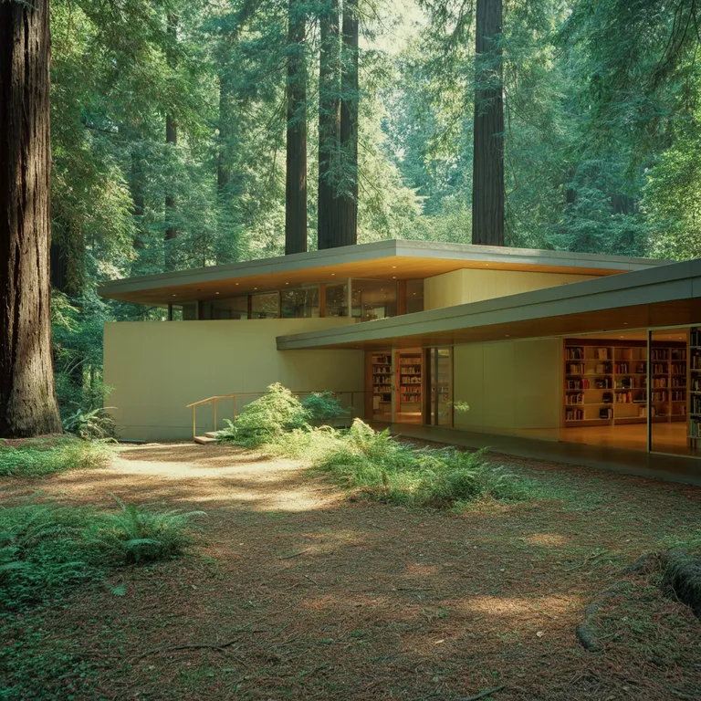 Hyper realistic tadao ando library surrounded by a redwood forest shot from the exterior on porta 400 film