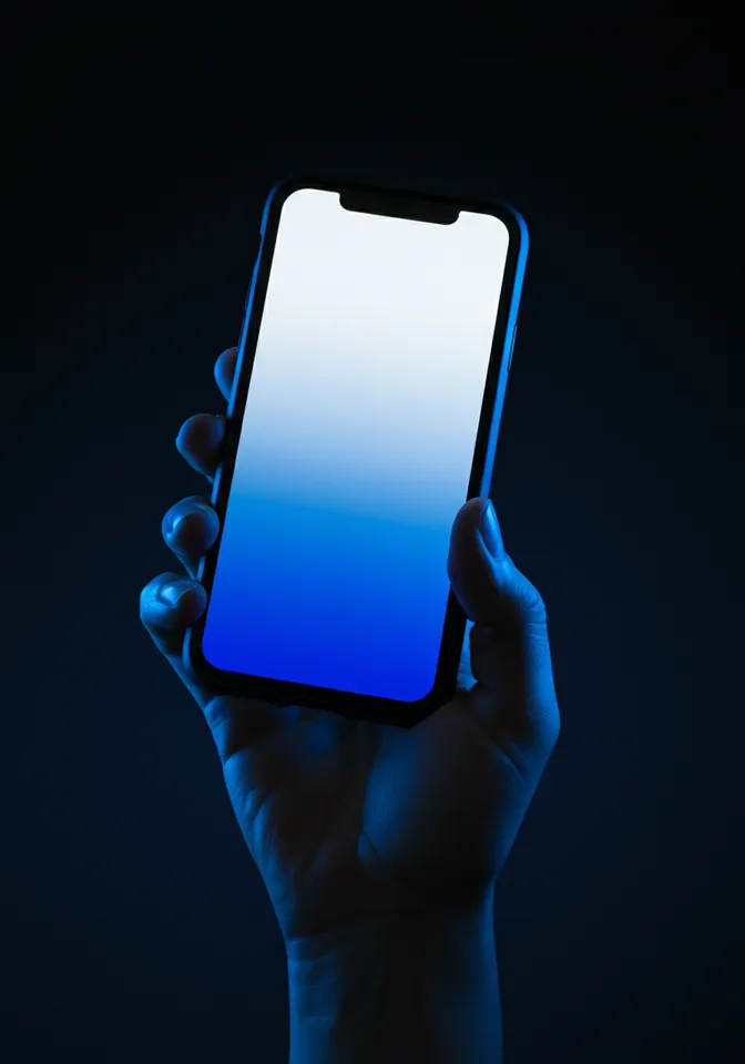 A close-up of fingers holding a smartphone with a blank screen that fades from electric indigo blue to white, with shadows and lighting so sharp the hand is almost black. The phone is encased in a slim black cover, and the fingers have short nails. The background features a gradient from black to electric indigo blue, creating a moody, minimalist composition. The image is centered on the phone and captured from a perpendicular angle, emphasizing its clean lines and simplicity. The sharp shadows and lighting contribute to a modern, cinematic atmosphere.