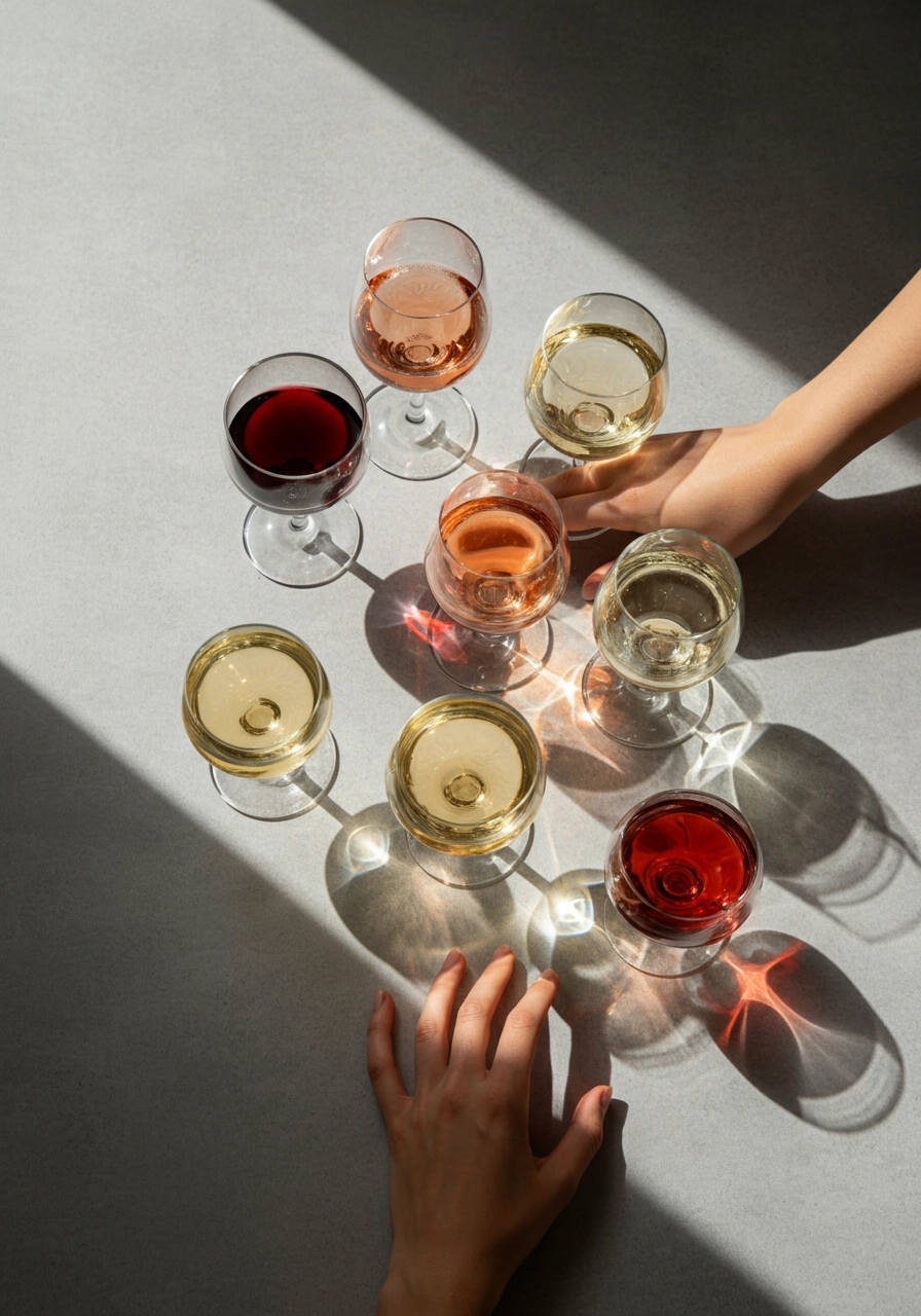 An elegant woman's hand with outstretched fingers reaches in, about to grab a glass of wine from a collection of wine glasses filled with various colors of wine, elegantly arranged on a light gray stone surface. The glasses hold red, white, and rosé wines, each casting distinct shadows and reflections. Sunlight streams softly across the scene, highlighting the translucent hues of the wines and creating a warm, inviting atmosphere. The image is shot from a top-down perspective, focusing on the play of light and the variety of bottles and glasses, evoking a sophisticated and relaxed mood.