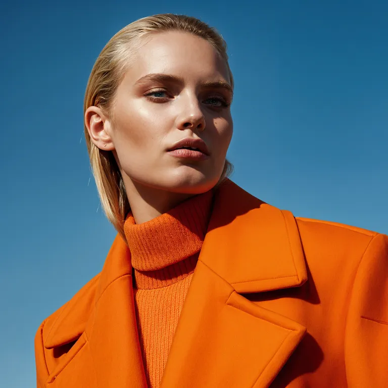 A close-up portrait photography of a blonde woman with a sharp and confident face, wearing an orange coat, under a bright blue sky during daytime. The style is minimalistic portraits with epic lighting, featuring exquisite pastel colors, edge rose lighting, Haute couture, in a Vogue editorial style, inspired by David LaChapelle photography, hyper detailed, photorealistic