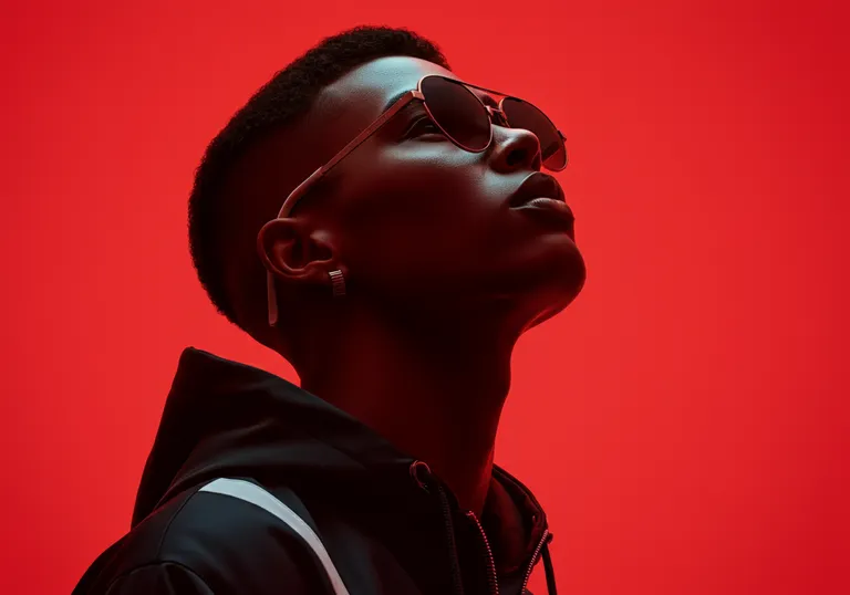A futuristic portrait of a person wearing sunglasses and a basketball hoodie. The side profile looking up is captured against a vivid red background. The lighting is sleek and polished, casting smooth highlights and deep shadows. The composition is centered on the person's face, with a sharp focus on the glasses. The mood is modern and tech-savvy creating a sleek, corporate atmosphere.