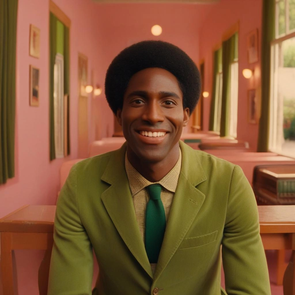 black man with short hair, casual clothes, smiling, green background, album cover aesthetic