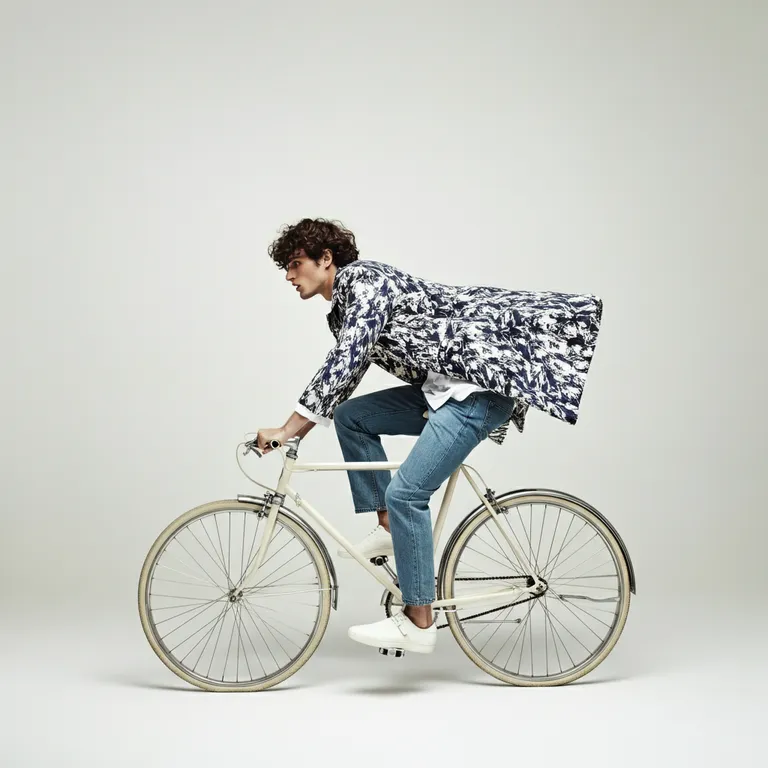 A man riding a bike, Pure white background, Clean clothes, summer, full-length photograph, HD photography