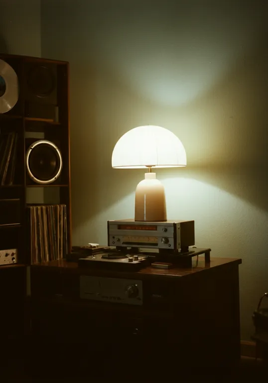 Una sala de música con vinilos y equipos de música hifi. Incluye una luz estilo bauhaus con luz calida