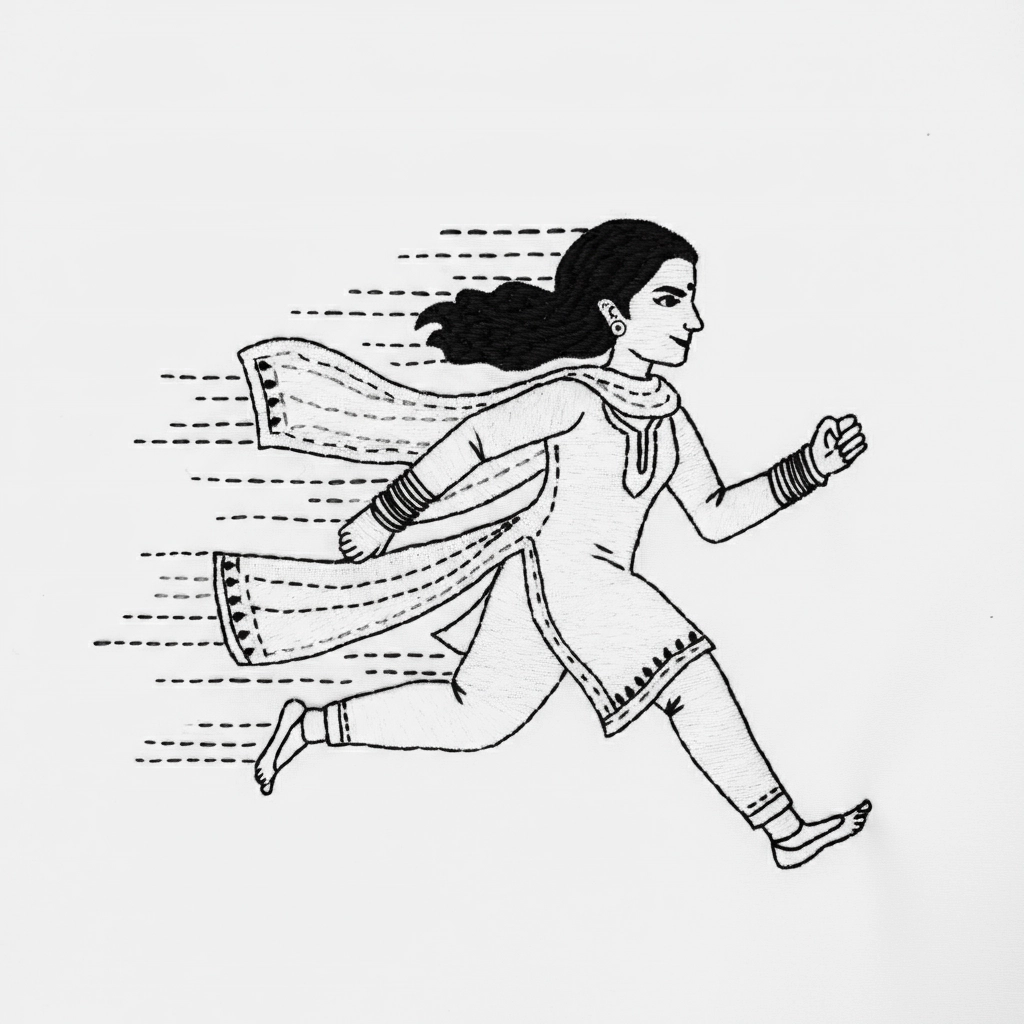 a black and white simple outline cartoonish quirky doodle of a south asian girl in a kameez, running extremely fast. drawn as if it's been stitched on using running kantha embroidery on a white canvas