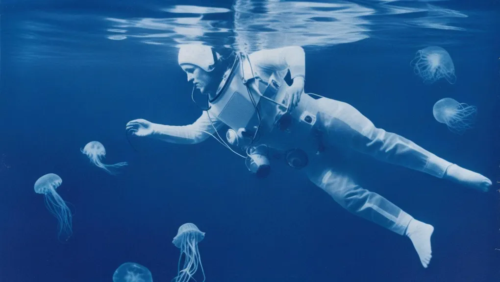 an astronaunt floating through a body of water, wearing a bioluminescent suit and surrounded by glowing jellyfish