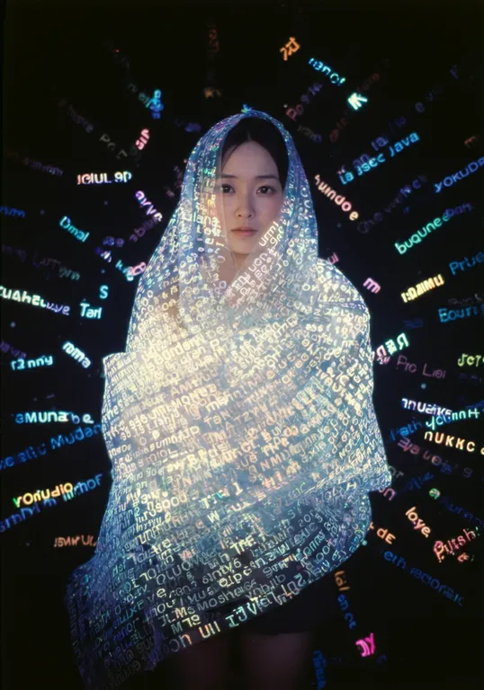 A scene from the anime, "h" combining holographic text with light effects to form an abstract pattern around her. She is wrapped in glowing white ethereal fabric that shines brightly against a dark background, with colorful neon lights illuminating her figure. The background features many bright colored words floating in space, creating a surreal atmosphere.