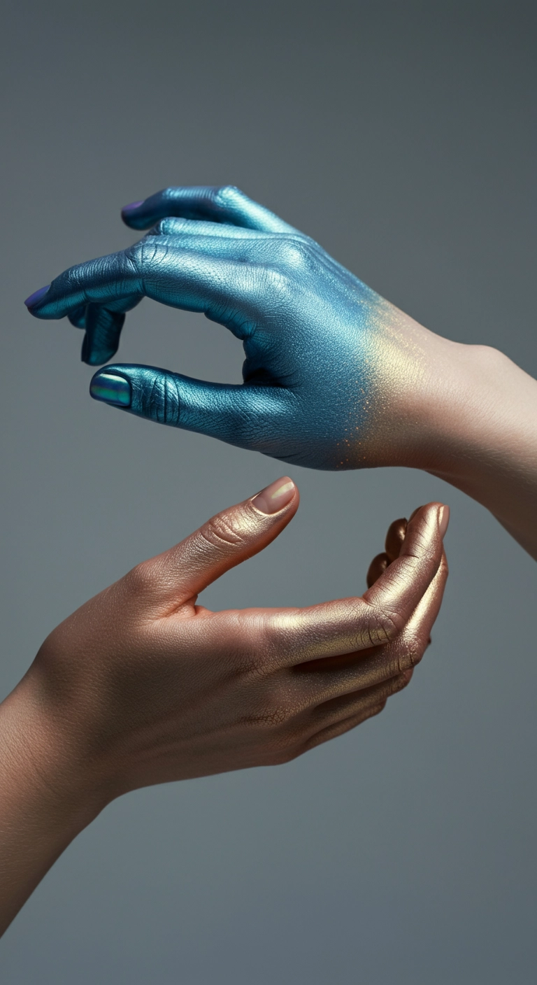 An artistic close-up composition of two hands as the central focus, their fingertips just barely touching in an intimate and symbolic gesture of connection. One hand is completely natural, with porcelain-like skin, soft rosy undertones, and delicate veins visible beneath the smooth surface. The other hand is partially painted in a luminous, blueish prismatic opal-inspired color, its surface shimmering with subtle iridescence. The opalescent hue transitions fluidly back to natural skin through a gradient of soft, earthy tones, blending seamlessly as the vibrant color recedes. The fade begins intensely at the base of the fingers, with brilliant blues and opalescent highlights, softening as it transitions toward the wrist into warmer, neutral tones. The hands are close, dominating the composition, with every crease, texture, and shimmering detail meticulously rendered. The background is a deep, rich grey, offering a minimalist yet elegant contrast that enhances the luminous interplay of color and texture. Soft, diffused lighting illuminates the prismatic surface, creating gentle highlights and shadows that emphasize the iridescence, the tactile quality of the skin, and the symbolic interaction. The mood is serene, introspective, and visually captivating, symbolizing transformation, duality, and connection. Shot with a Hasselblad H6D-100c, the image captures every intricate detail of the skin, paint application, and tonal transitions with cinematic precision. Highly detailed, luminous, and deeply poetic.