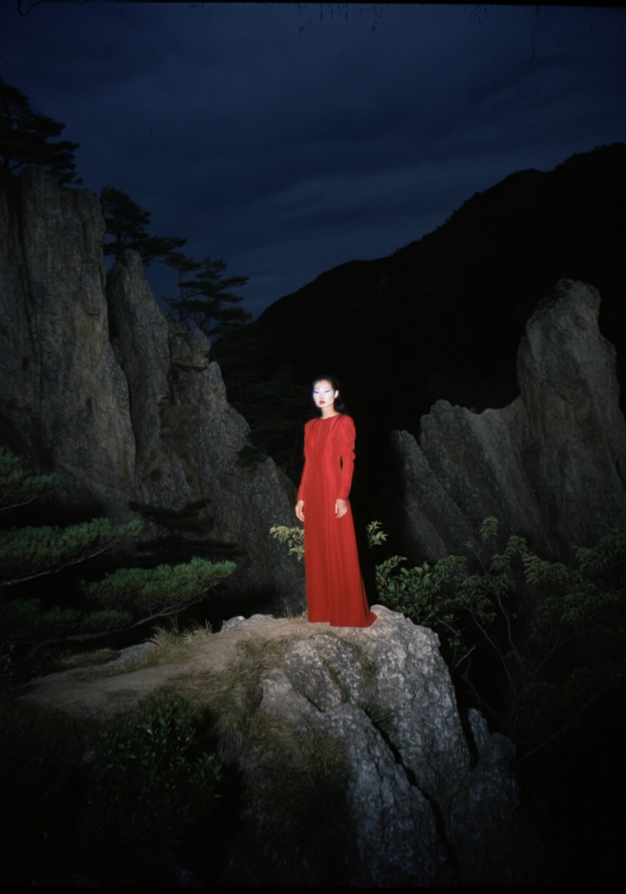 The image captures a dramatic mountainous landscape at night, with towering rock formations standing stark against the dark sky. The rugged cliffs are partly illuminated by soft moonlight, casting shadows that accentuate the textures of the rocks and the sparse trees clinging to the edges. In the foreground, an Asian model in a striking red long dress stands on the rock in the front view, her figure contrasting beautifully with the dark surroundings. The dress flows elegantly in the night air, its rich color standing out against the muted tones of the landscape. The scene exudes a sense of mystery and high fashion, blending the natural beauty of the night with the striking presence of the model. The cool, tranquil atmosphere of the mountains is contrasted by the boldness of her attire, creating an unforgettable and surreal fashion momentю