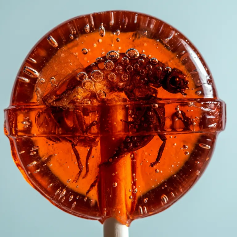 ultra-realistic photograph, close-up of a transparent colored lollipop with a detailed object (such as an insect or tentacle) deeply embedded inside, the object appears partially obscured by the thick layers of the lollipop, areas of the candy near the object show subtle cloudiness and distortion, light passing through the lollipop refracts around the object, creating soft highlights and shadows, bubbles and micro-cracks visible within the candy, adding texture and depth, the object itself reflects the color of the candy, with some parts more blurred and diffused due to light scattering, glossy and smooth surface of the lollipop with gentle reflections, placed on a bright neutral background to emphasize the transparency and natural light refractions, giving the illusion that the object is truly frozen within