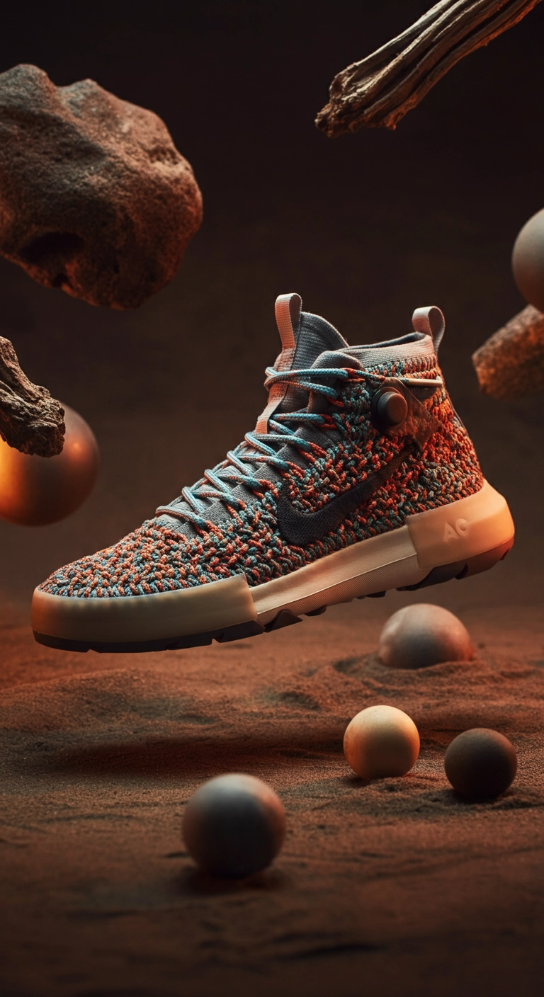 Hyper realistic photography of One concept high top sneaker shoe made of recycled colourful climbing ropes, using minimalist and futuristic design style, trending on Pinterest, floating amongst abstract raw material 3D shapes, subtle colour palette, sustainable, eco friendly, trendy advert from Nike ACG, canon 50mm lens