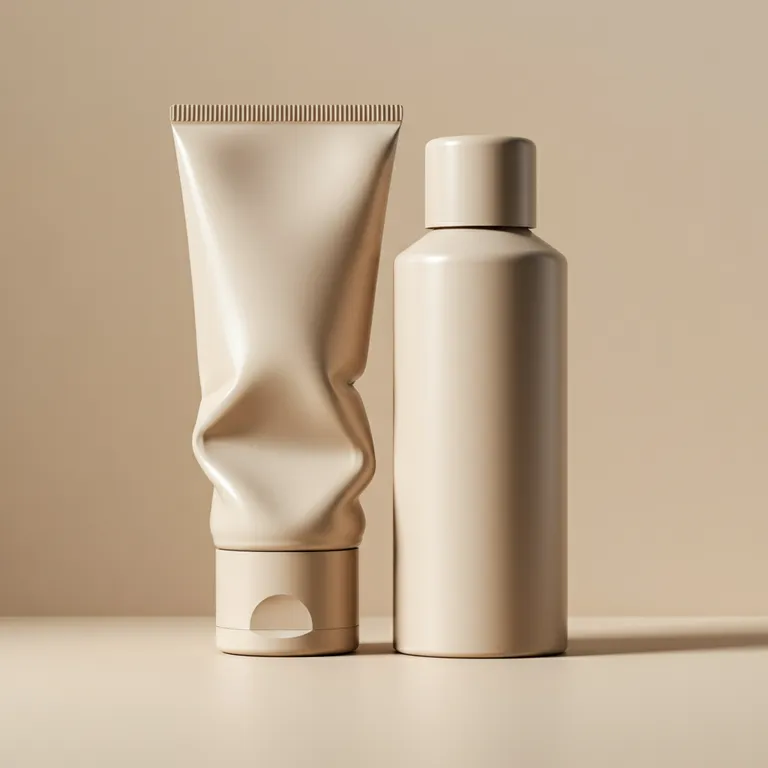 A pair of cylindrical objects resembling large tubes with caps, positioned vertically on a smooth, beige background. The left tube displays an artistic fold, revealing an intriguing asymmetry. The right tube appears more typical with a visible cap, adding to the geometric tension. Muted beige tones dominate, with soft lighting enhancing the minimalist and abstract atmosphere. The composition is centered and balanced, focusing on the contrast between the shapes and the subtle play of light and shadows, creating a calm and contemplative mood.