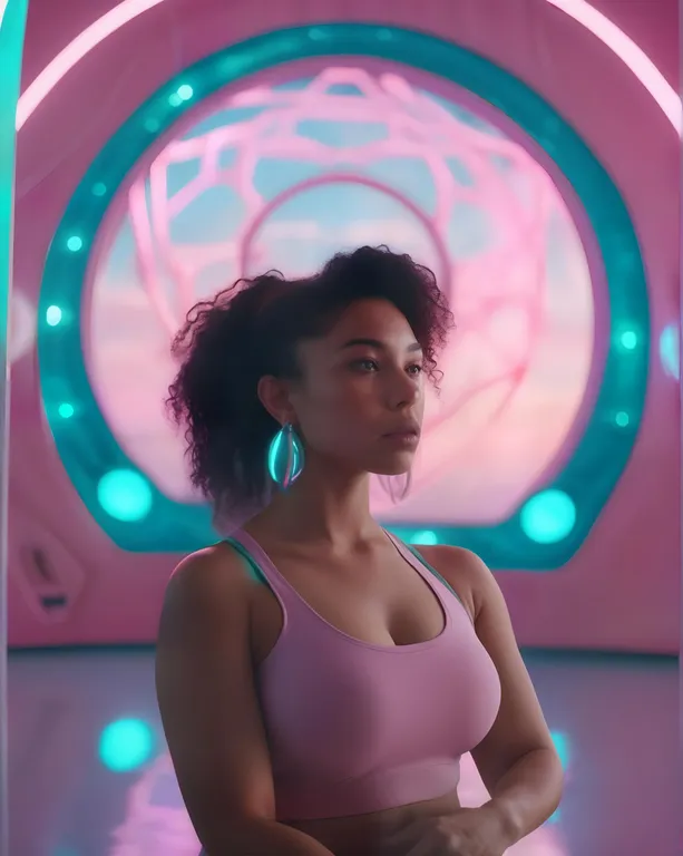a very curvy, almost heavy yet beautiful thick-bodied and natural mixed race woman doing yoga in a retro funky spaceship-like setting with controls and knobs, sacred geometry, portal, sky with clouds and a white moon in the background through the window to space, a woman doing yoga in a fashion-forward patterned yoga spacesuit, retro futuristic, playful, avant-garde, diverse realistic curvy women, diverse skin and body types, unexpected pops of rainbow accents, symmetrical, psychedelic