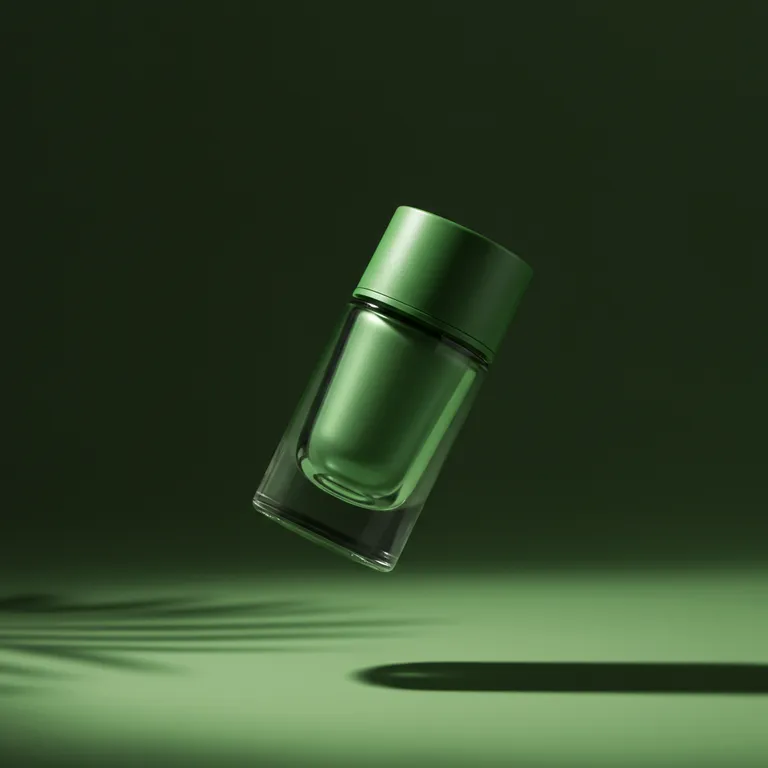 A small and long green glass skincare tub with a green lid, floating weightlessly against a green background. Captured in sharp, high-resolution detail with a professional photography style. The composition is clean and minimal, with soft shadows and natural reflections on the surface and background. The lighting is warm and diffused, evoking a fresh, adventure-inspired aesthetic.