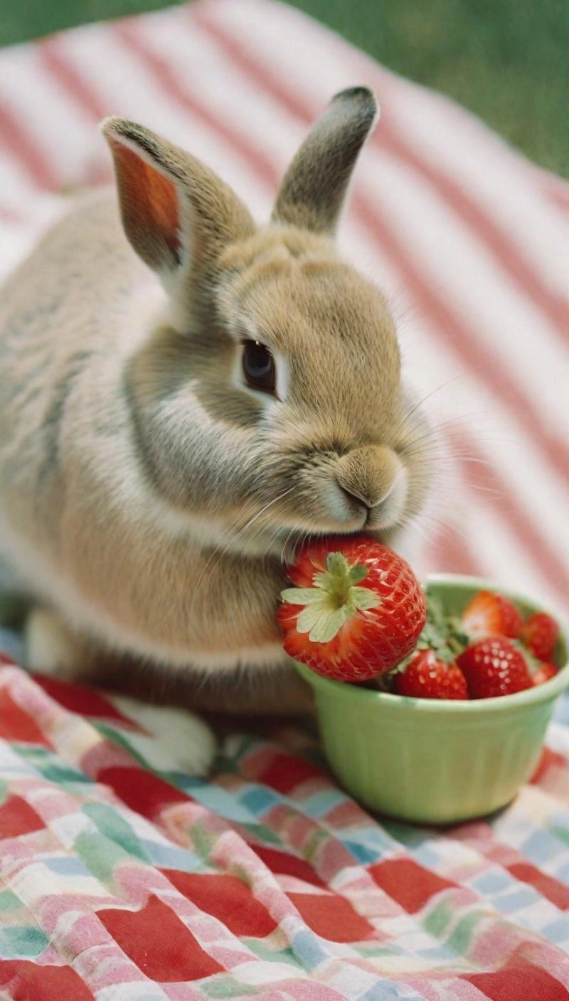a cute small bunny eating a strawberry on a vibrant summer day at a colorful picnic