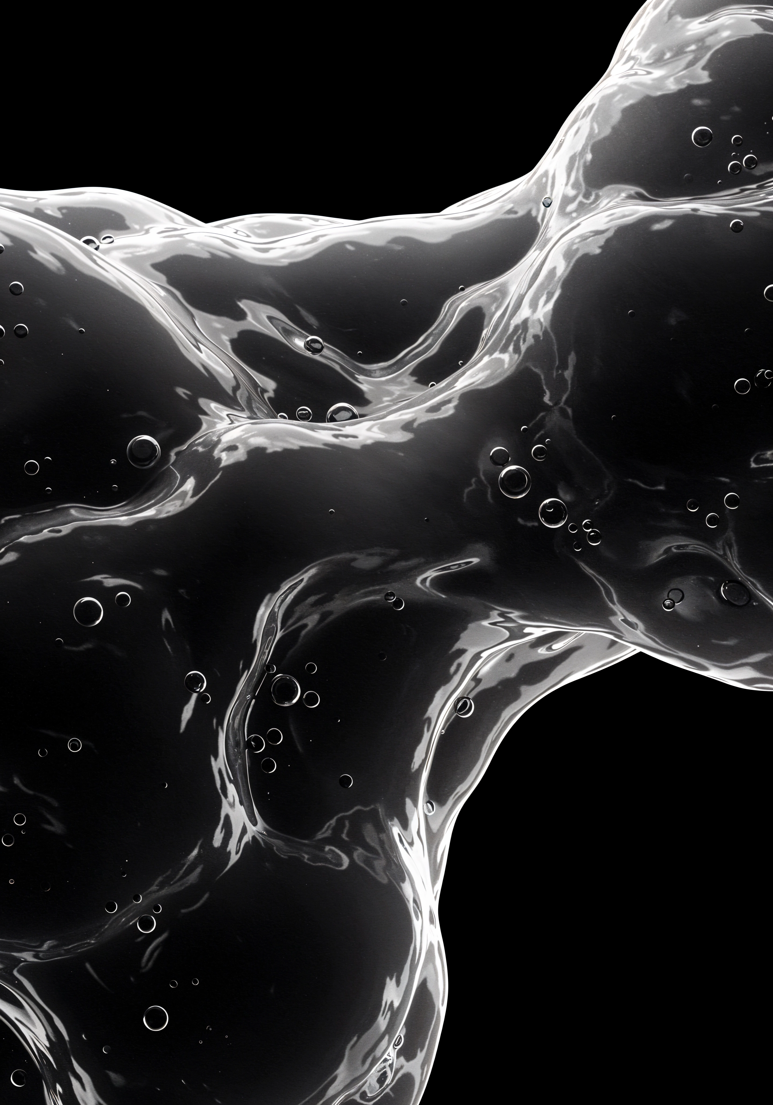 Hyperreal black-and-white macro abstraction of a dense, viscous liquid mass — alien oil-like substance folding and rippling in chaotic micro-currents. Sharp directional lighting fractures across the glossy surface, producing intense contrast: pitch-black shadows and piercing highlights. Bubbles distort the form like trapped organic anomalies. Background is infinite void black. Visual tone is aggressive, futuristic, synthetic — like industrial biotech matter captured mid-mutation.