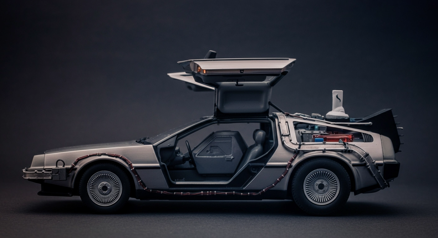 imagine Les personnage de "retour vers le futur" pendant un voyage dans le temps entre 2 Epoques a bord de la Delorean