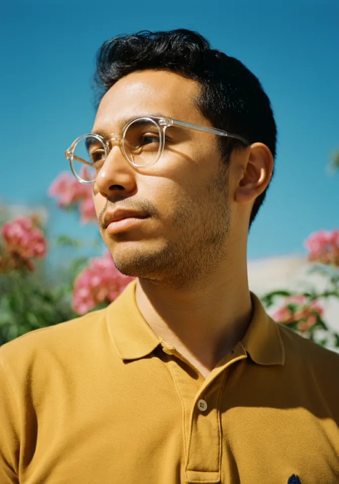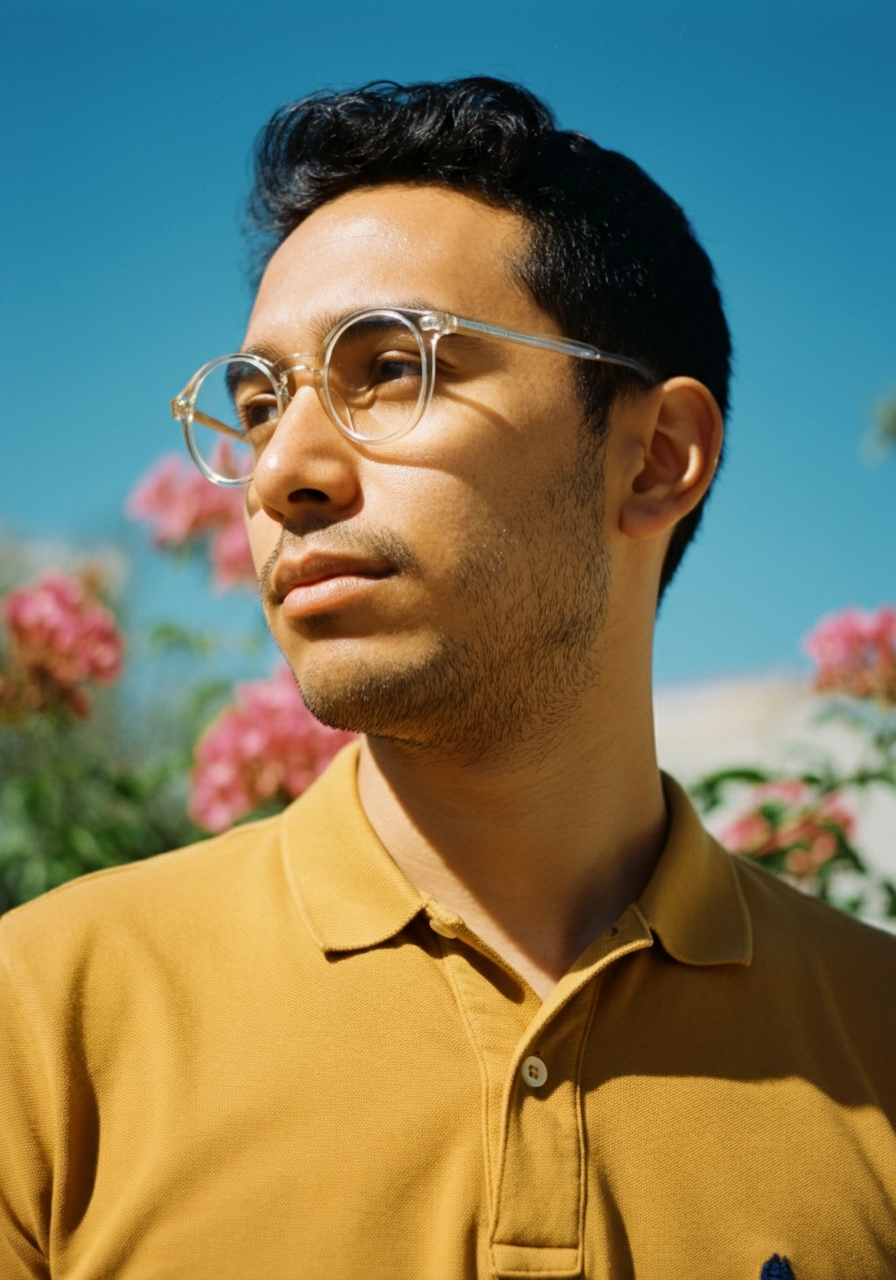 A close-up portrait of a man with a thoughtful expression, wearing round, clear-framed glasses. He is dressed in a mustard-colored polo shirt that contrasts beautifully with the bright blue sky in the background. The image has a calm, serene vibe, enhanced by soft pink flowers blurred in the foreground, adding a gentle, organic touch. The subject’s skin is illuminated by natural sunlight, creating a warm, radiant feel. This minimalist composition blends simplicity and elegance, authentic street style.